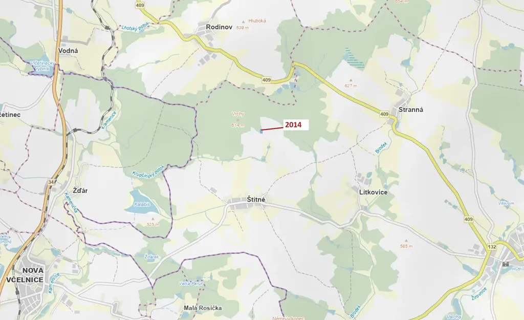 Lesní pozemek o výměře 2931 m2, parcelní číslo 2014, podíl 1/1, katastrální území Štítné, obec Žirovnice, obec s rozšířenou působností Pelhřimov, okres Pelhřimov, Kraj Vysočina. Částečně po těžbě.