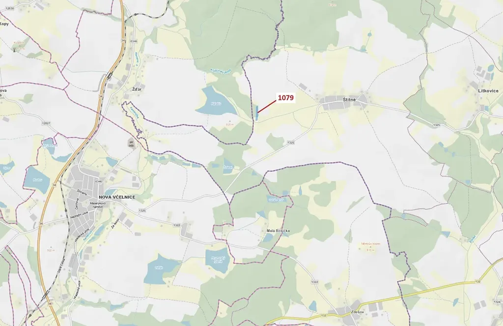 Lesní pozemek o výměře 5041 m2, parcelní číslo 1079, podíl 1/1, katastrální území Štítné, obec Žirovnice, obec s rozšířenou působností Pelhřimov, okres Pelhřimov, Kraj Vysočina. Částečně po těžbě.