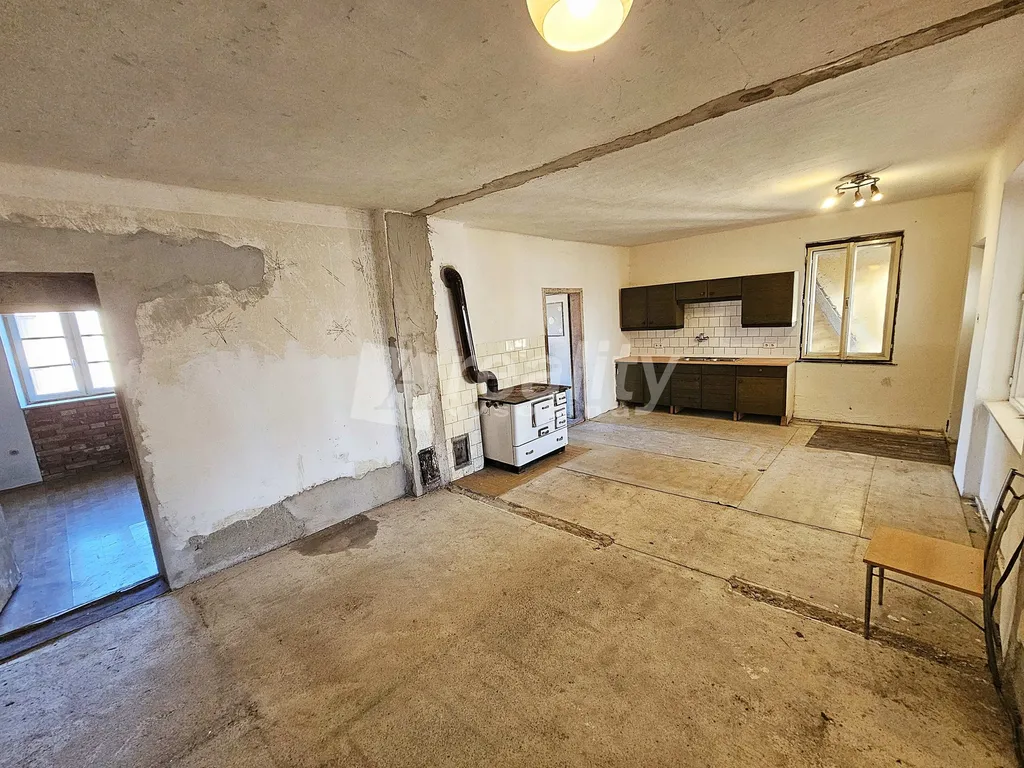 Přední obytná část je určena spíše k rekonstrukci. V obývacím pokoji a ložnici s orientací do ulice jsou plastová okna. Dominantou je velká kuchyň, která může sloužit i jako pokoj s kuchyňským koutem. Dále je zde možnost půdní vestavby. Do domu je přiveden obecní vodovod, aktuální vytápění zajišťují kamna, v případě potřeby je přímo ve zdi domu plynová přípojka. Přístup do dvora je umožněn vysokým krytým průjezdem, který lze využít i k parkování vozidla. K tomuto účelu slouží i vedlejší garáž, kam se za sebe vejdou dva osobní automobily. Na tuto část navazuje chlév/dílna.