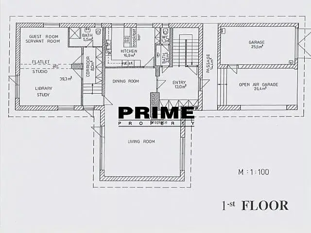 Dům je třípodlažní (suterén, přízemí a podkroví). Dispozice přízemí domu: vstupní hala, velký obývací pokoj (61m2) s krbem, jídelní částí a vstupem na zahradu, plně vybavená kuchyň s kuchyňskou linkou a novými spotřebiči Bosch (sklokeramická varná deska, trouba, myčka, lednice s mrazákem, mikrovlnná trouba a pračka), ložnice pro hosty, pracovna či ložnice, koupelna a samostatné WC. 1. patro: hlavní ložnice s vlastní koupelnou, další dvě ložnice, další koupelna, šatna a komora. Suterén: velká místnost (39m2) (vhodná k využití jako party/TV místnost nebo herna, posilovna či skladová místnost), vinný sklípek a prádelna.