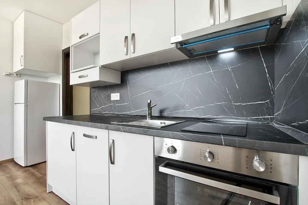 Byt tvoří obytný prostor s plně vybavenou kuchyňskou linkou - elektrická trouba, sklokeramická varná dvou plotýnka, digestoř, integrovaná myčka nádobí, pračka se sušičkou, mikrovlnná trouba a samostatně stojící lednička s mrazákem.
