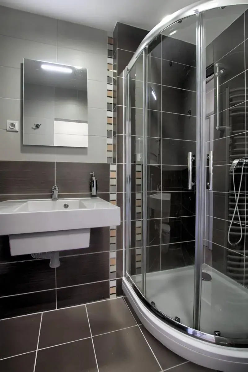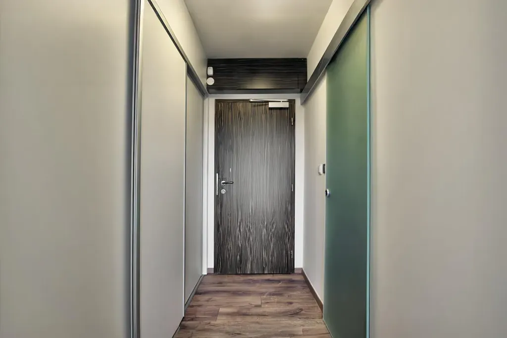 Praktická předsíň je vybavená velkou skříní. Koupelna se sprchovým koutem, keramické umyvadlo, toaleta a fén.