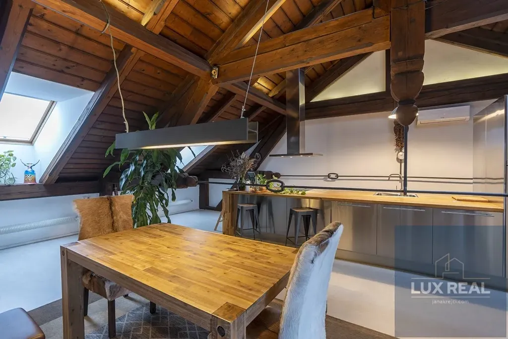 Ve velkém otevřeném prostoru je umístěna kuchyně a obývací pokoj s prosvětlenými střešními okny a vstupem na terasu s krásnými výhledy. Členitost tohoto otevřeného prostoru vytvářejí příjemnou atmosféru a propůjčují mu jas a vzdušnost. Kuchyň je vybavena moderními spotřebiči a splňuje všechny požadavky na funkčnost a komfort při vaření. Po schodech se dostanete na vyvýšený spací kout. V tomto prostoru máte i skříněmi oddělený prostor, kde je koutek sloužící jako pracovna.