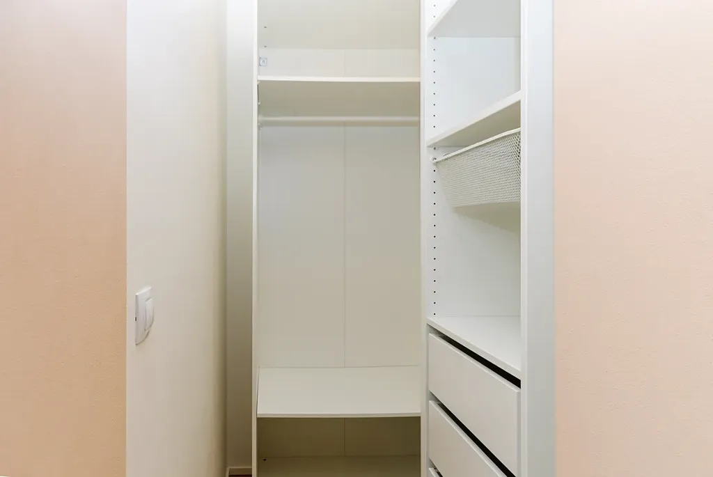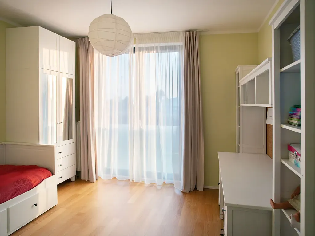 Ložnice (13,3 m²) a dětský pokoj (13 m2) jsou orientované na severovýchod. Manželská ložnice má vlastní šatnu (2,4 m2). V předsíni se nachází velká vestavěná skříň na míru, která poskytuje spoustu úložného prostoru. Koupelna (4 m²) je vybavena vanou a umyvadlem, toaleta je zvlášť. V obytných místnostech jsou dřevěné podlahy, v koupelně je položena dlažba.