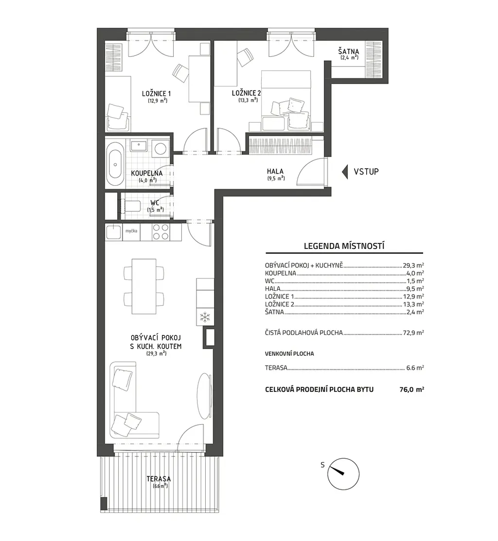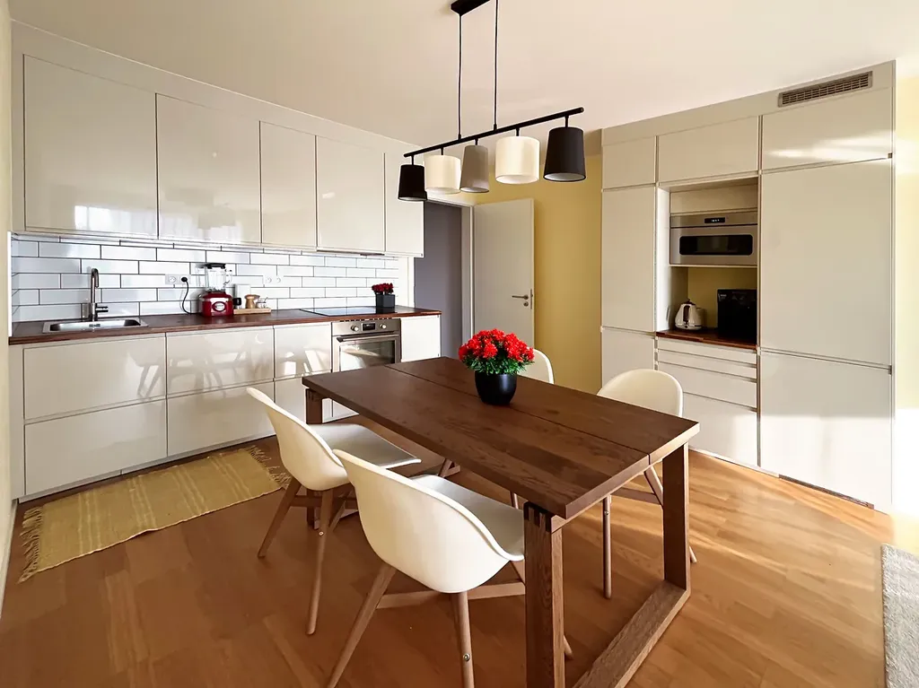 Obývací pokoj s kuchyňským koutem (29,3 m²), orientovaný na jihozápad, je světlý a vzdušný, s přímým vstupem na terasu (6,6 m²), která poskytuje ideální místo pro relaxaci. Kuchyňský kout je plně vybaven všemi spotřebiči: indukční varná deska, digestoř, elektrická a mikrovlnná trouba a myčka nádobí.