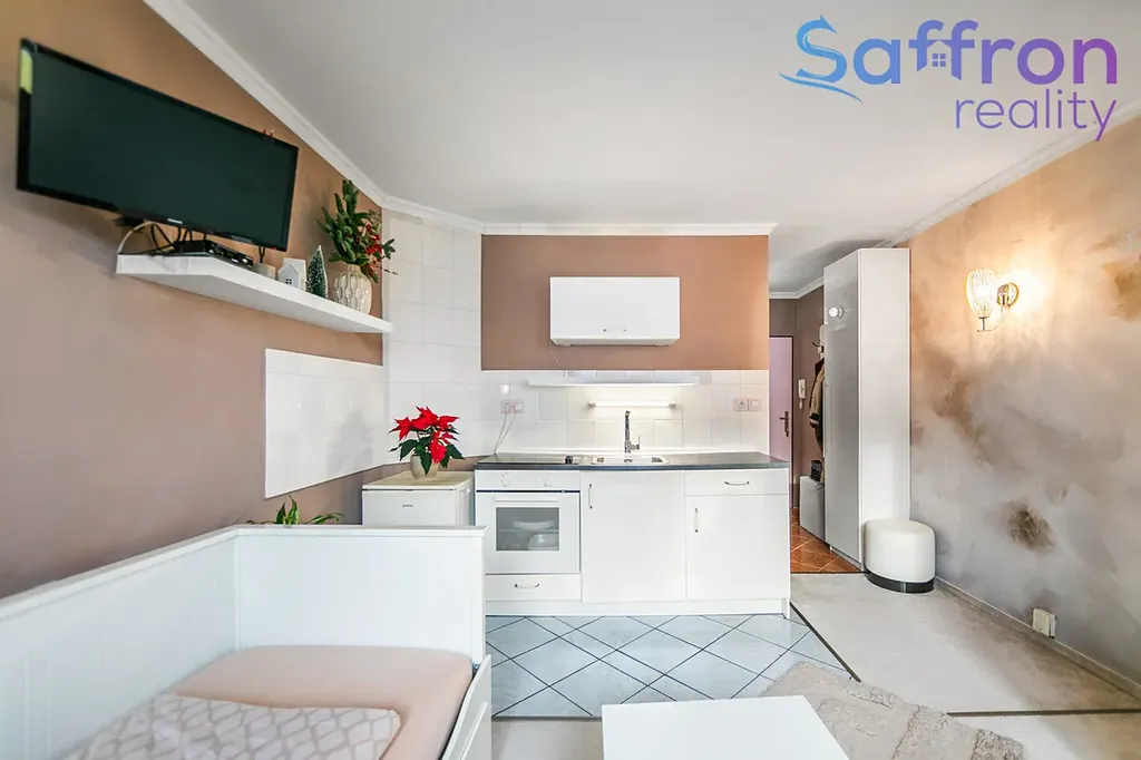 Dispozice bytu je řešena jako obytný prostor s kuchyňským koutem, který je funkčně oddělený od klidové části. Kuchyňská linka navazuje na obytnou část, kde je dostatek místa pro denní i noční zónu. Koupelna je vybavena sprchovým koutem a toaletou.