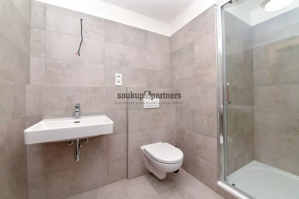 Vše nové - Kuchyňská linka vč. spotřebičů, koupelna se sprchovým koutem a toaletou, na podlahách keramická dlažba a vinyl.