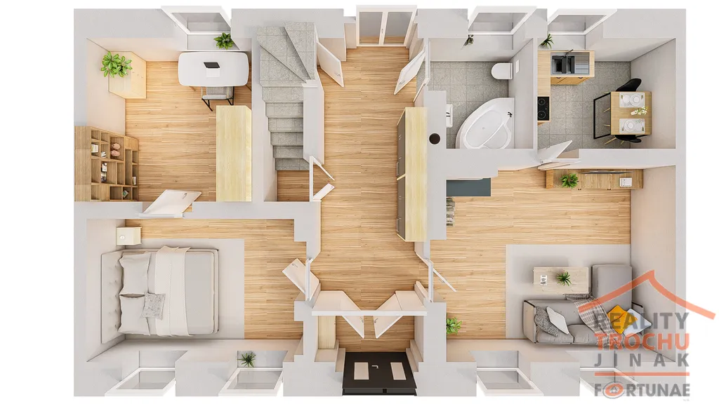 Podkroví: obytná hala, ložnice, koupelna (sprchový kout, WC, bidet), zasklen. lodžie. Celkem plocha 77 m².