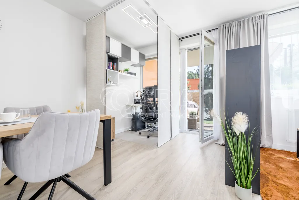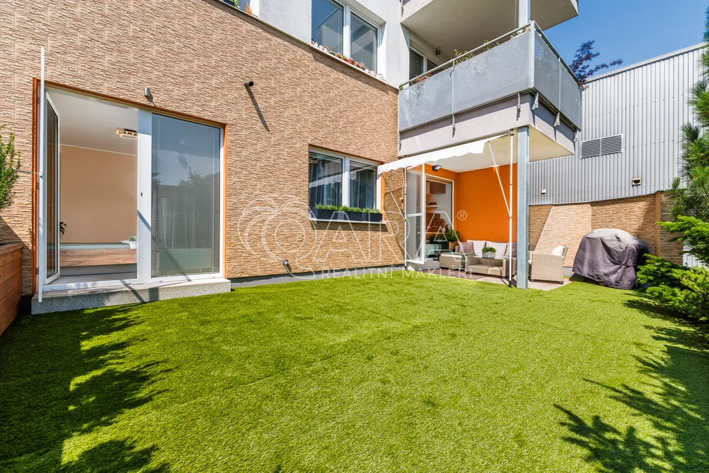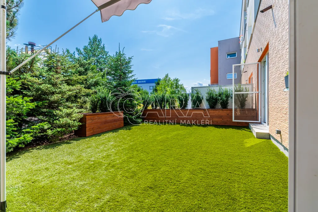Byt prošel kompletní designovou úpravou a rekonstrukcí koupelny a disponuje vstupní chodbou, praktickou spíží, prostorným obývacím pokojem s moderní kuchyní, jídelním koutem a pracovním prostorem, ložnicí, šatnou a koupelnou s WC. Dominantou bytu je velká terasa o výměře 52 m² orientovaná na východ s možností umístění posezení, vířivky či sušení prádla. Z obou hlavních místností je přímý výstup na terasu. Součástí je také kolárna sdílená pouze se dvěma dalšími byty.