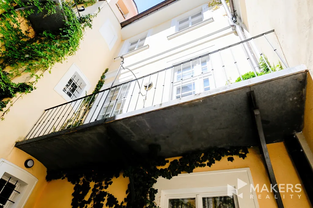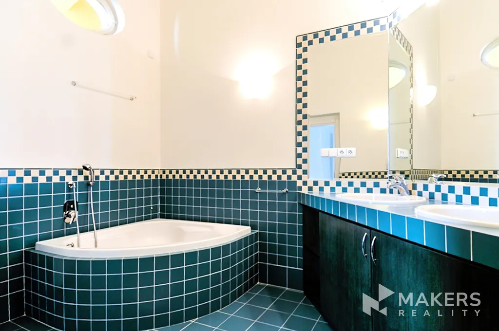 Byt o celkové ploše 178 m2 s vlastním vchodem z nádvoří budovy. Po vstupu do bytu přes chodbu se můžeme dostat do první ložnice s oddělenou koupelnou s vanou. Dále na levé straně bytu se nachází obývací místnosti s jídelnou, přes kterou máme přístup do kuchyně, koupelny se sprchovým koutem a komory. Velkým plusem tohoto bytu je venkovní prostor o velikosti 35 m2.