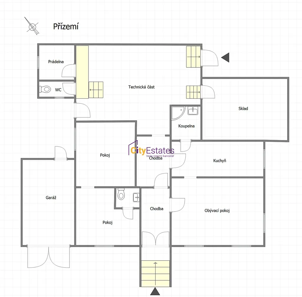 Do domu jsou dva vchody, hlavním vchodem z ulice vejdete do chodby, z níž máte vstupy do privátní části domu se dvěma ložnicemi a WC a na druhé straně se nachází vstup do obývacího pokoje, kuchyně a koupelny. Chodbou vejdete do prostorného technického zázemí domu, kde je další samostatné WC, prádelna, sklady, vstup do sklepa a druhý vstup do domu ze zahrady.