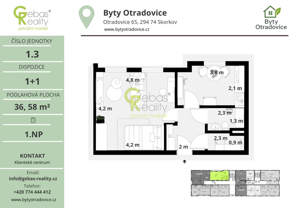 Ve výhradním zastoupení si Vás dovolujeme oslovit nabídkou moderní bytové jednotky o dispozici 1+1 a celkové užitné ploše 38,4m², která se nachází v kompletně zrekonstruovaném bytovém domě v obci Otradovice – Skorkov pouhých 5 minut od Brandýsa nad Labem – Staré Boleslavi. Projekt Byty Otradovice zahrnuje celkem 16 bytových jednotek různých velikostí a nabízí kvalitní a komfortní bydlení v klidné lokalitě s výbornou dostupností do Prahy, Brandýsa nad Labem – Staré Boleslavi i Mladé Boleslavi. Součástí kupní ceny je parkovací stání před domem, kuchyňská linka vyrobená na míru od truhláře včetně vestavných spotřebičů, kompletní sanita v koupelně značky JIKA a zděný sklep o minimální ploše 15 m² umístěný v suterénu domu.