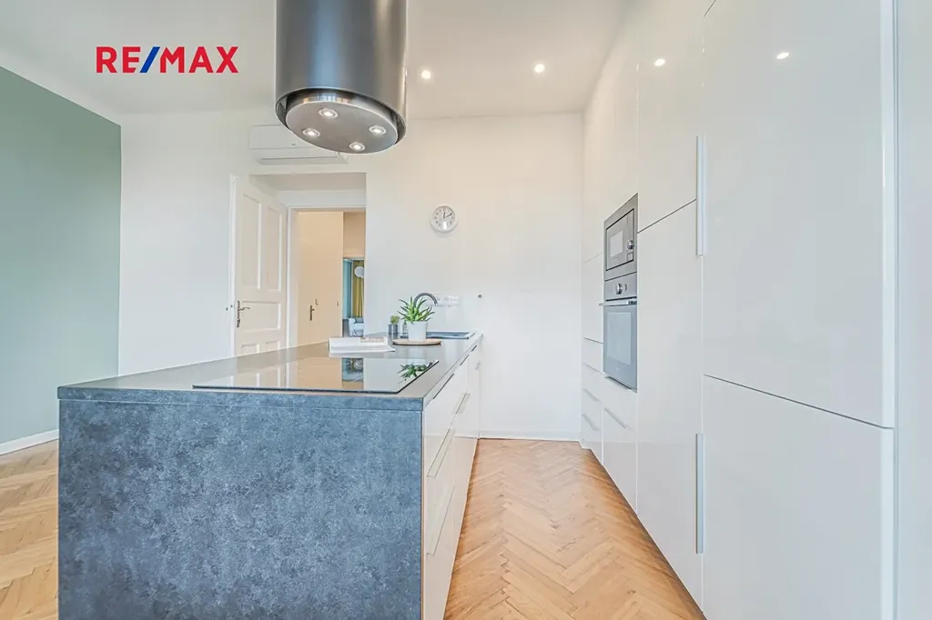 Bytová jednotka v osobním vlastnictví prošla v r. 2018 kompletní, ale velmi citlivou rekonstrukcí s důrazem na zachování ducha nemovitosti a zároveň na propojení původních prvků s moderním bydlením. Renovace dřevěných parketových podlah, interiérových dveří s obložkovými zárubněmi z masivního dřeva, nová avšak dobová dřevěná špaletová okna včetně kování s izolačním trojsklem - vše doplněno moderní kuchyňskou linkou s vestavnými spotřebiči, luxusní koupelnou či klimatizací. Obývací pokoj s kuchyní je orientován na východ s výhledem na Vltavu a Vyšehrad. Okna ložnic pak na západ, do vnitrobloku. Na první pohled Vás zaujme mnoho na míru zhotovených úložných prostor v podobně vestavných skříní, polic a šatníku, včetně průchozí šatny v ložnici. Velkou výhodou je uzavíratelná komora s regálovým systémem, kde je umístěna pračka a sušička. Technická místnost s plynovým kotlem, jenž představuje vlastní zdroj topení a ohřevu TUV je zcela oddělena.