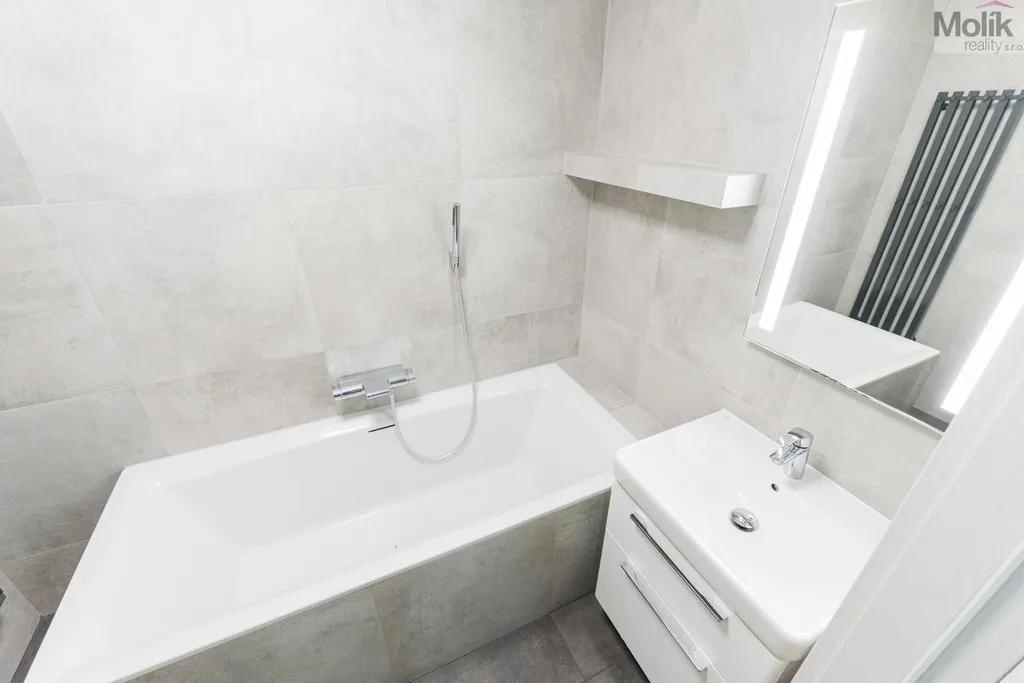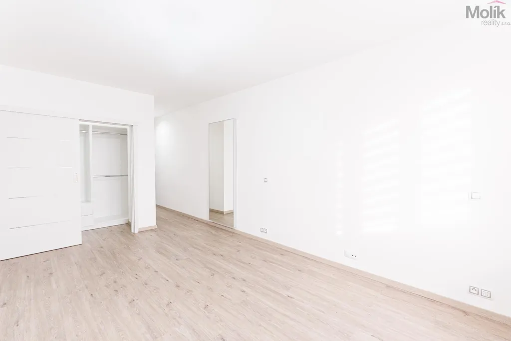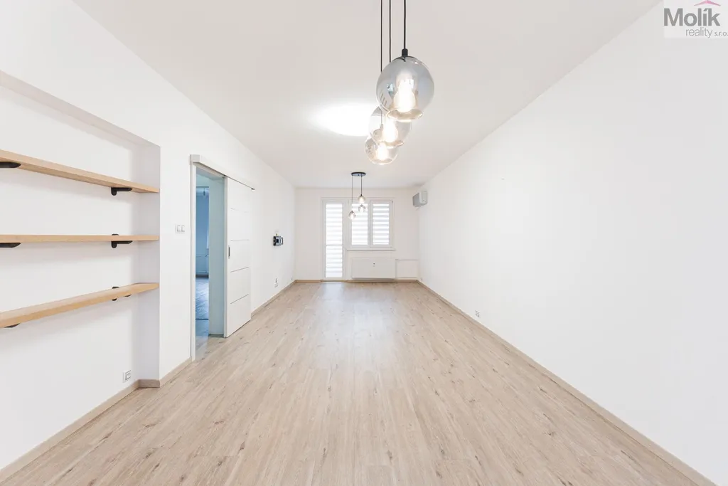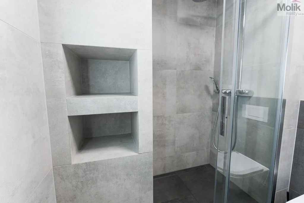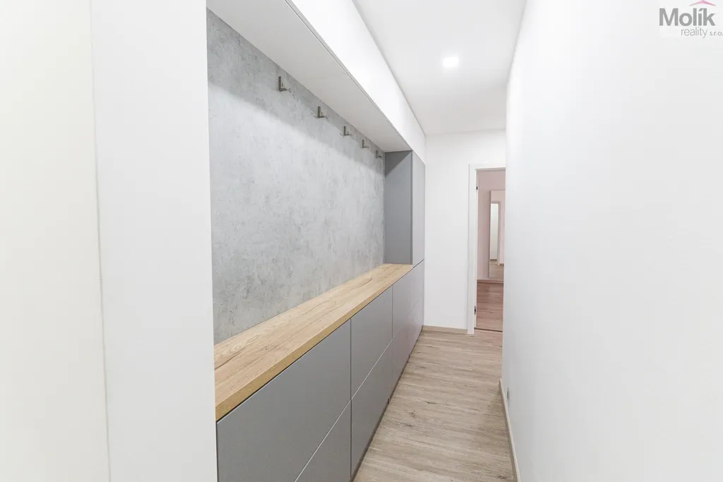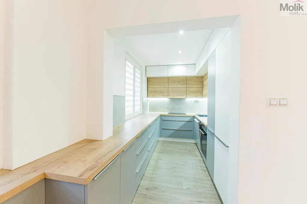 Byt je po kompletní rekonstrukci (kuchyňská linka, elektřina, 2x zděné jádro, podlahy, dveře, praktická šatna, dvě koupelny..)
