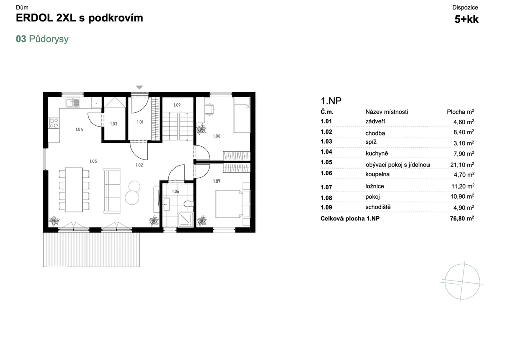 Ve spolupráci se stavební firmou MUDUM je pro pozemek zpracována situace a studie rodinného domu o dispozici 5+kk s užitnou plochou 122 m².