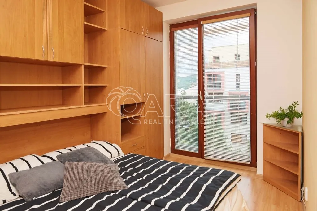 Ze vstupní chodby, kde nalezneme šatní skříň a botník, vcházíme do prostorného obývacího pokoje s kuchyňským koutem. V místnosti je pohodlná sedací souprava, jídelní stůl, obývací stěna s TV a wifi routerem. V kuchyňském koutu je plně vybavené kuchyňská linka (lednice, mrazák, myčka, mikrovlnná trouba atd.). Z obytné místnosti vcházíme do ložnice s manželskou postelí s mnoha úložnými prostory na stěně za postelí. Přímo na ložnici navazuje samostatná prostorná koupelna s vanou a pračkou. Dostatek světla a slunce zajistí v obou místnostech velká francouzská okna, která jsou orientována na jih.