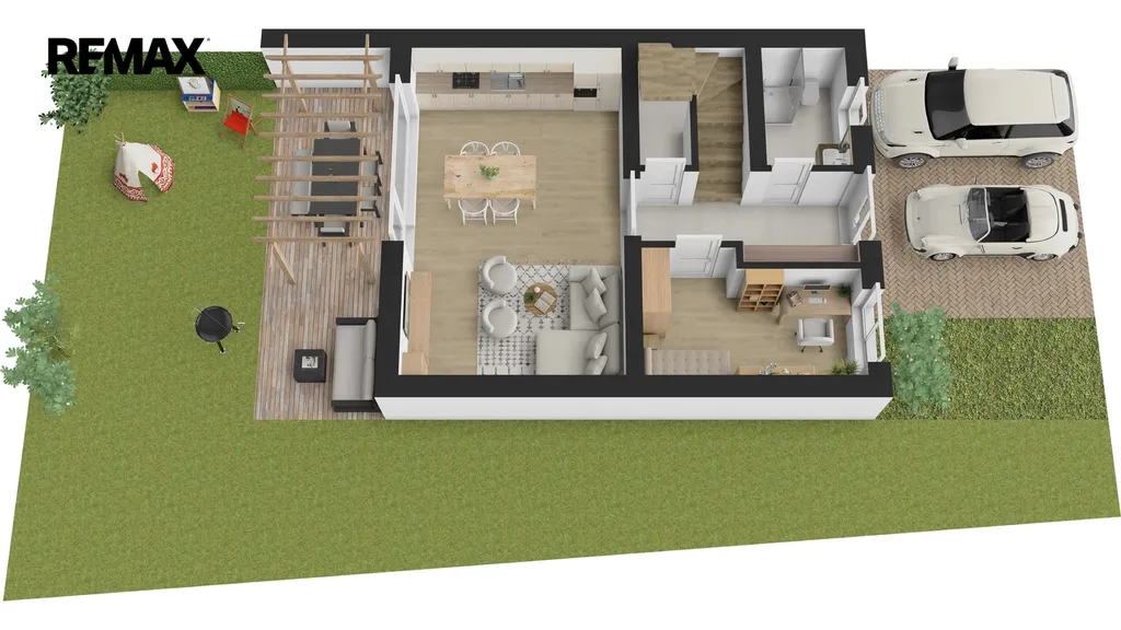 V přízemí domu bude vstupní chodba se schodištěm do patra, kde při vstupu budete mít po pravé straně koupelnu se sprchovým koutem a WC, na levé straně bude výklenek pro vestavěnou šatní skříň. Dále menší pokoj vhodný jako ložnice nebo pracovna. Rovně z chodby projdete do velkého obývacího pokoje, který bude spolu s velkým kuchyňským koutem a jídelnou dominantou celého domu. Z tohoto obývacího pokoje bude vstup na zahradu s terasou, kde si můžete postavit pergolou. Zahrada bude oplocená se zadní brankou pro pěší vstup. V chodbě domu pod schodištěm budete mít úložný prostor a v patře na vás budou čekat tři pokoje a hlavní koupelna s vanou a WC. Jako bonus vám zhotovíme plnohodnotnou velkou místnost v podkroví, kam povede běžné schodiště. Podkrovní pokoj bude mít všechny náležitosti jako jsou střešní okna, podlahovou krytinu, sádrokartonové podhledy i rozvody elektřiny. Tento podkrovní prostor můžete využít jako ložnici, pracovnu nebo hernu. Velkoformátová okna zajistí dostatek přirozeného světla a příprava na venkovní žaluzie umožní regulaci teploty v interiéru. Před domem budou dvě parkovací stání. Tepelné čerpadlo bude umístěné směrem do ulice.
