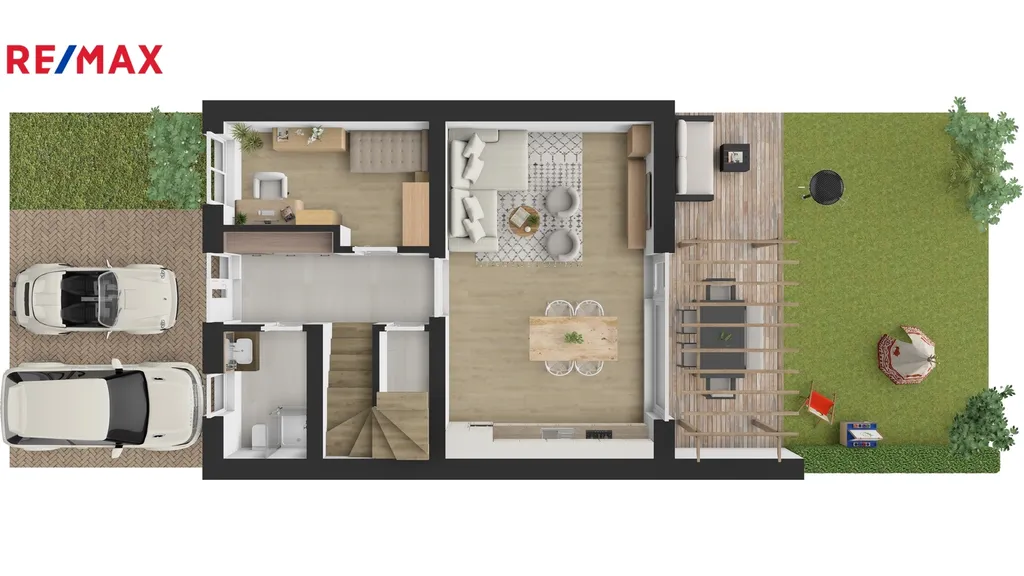 V přízemí domu bude vstupní chodba se schodištěm do patra, kde při vstupu budete mít po pravé straně koupelnu se sprchovým koutem a WC, na levé straně bude výklenek pro vestavěnou šatní skříň. Dále menší pokoj vhodný jako ložnice nebo pracovna. Rovně z chodby projdete do velkého obývacího pokoje, který bude spolu s velkým kuchyňským koutem a jídelnou dominantou celého domu. Z tohoto obývacího pokoje bude vstup na zahradu s terasou, kde můžete umístit pergolu. Zahrada bude oplocená se zadní brankou pro pěší vstup. V chodbě pod schodištěm budete mít úložný prostor a v patře na vás budou čekat tři pokoje a hlavní koupelna s vanou a WC. Jako bonus vám zhotovíme plnohodnotnou velkou místnost v podkroví, kam povede schodiště. Podkrovní pokoj bude mít všechny náležitosti jako jsou střešní okna, podlahovou krytinu, sádrokartonové podhledy i rozvody elektřiny. Tento podkrovní prostor můžete využít jako ložnici, pracovnu nebo hernu. Velkoformátová okna zajistí dostatek přirozeného světla a příprava na venkovní žaluzie umožní regulaci teploty v interiéru. Před domem budou dvě parkovací stání.