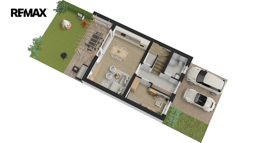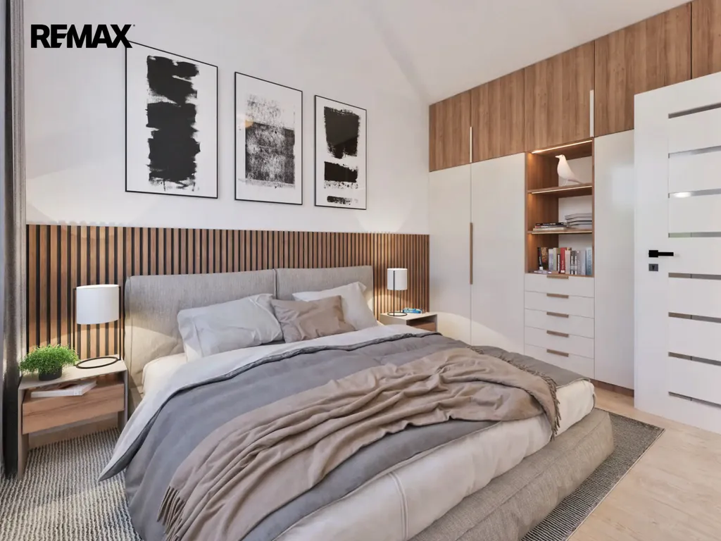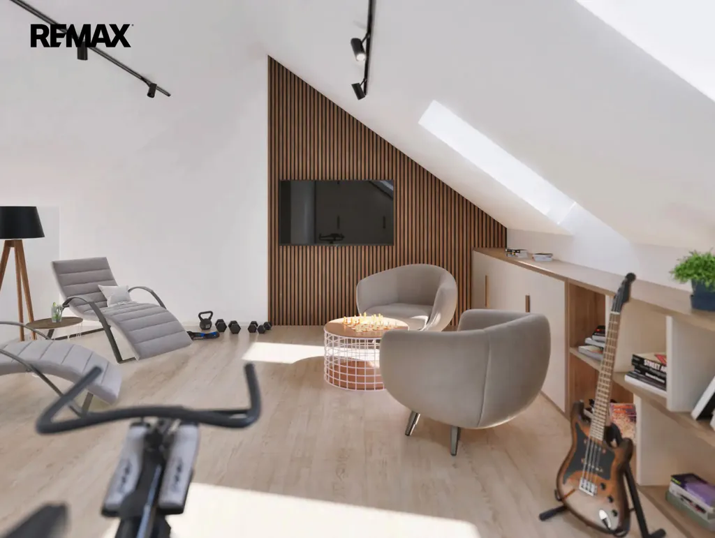 V přízemí domu bude vstupní chodba se schodištěm do patra, kde při vstupu budete mít po pravé straně koupelnu se sprchovým koutem a WC, na levé straně bude výklenek pro vestavěnou šatní skříň. Dále menší pokoj vhodný jako ložnice nebo pracovna. Rovně z chodby projdete do velkého obývacího pokoje, který bude spolu s velkým kuchyňským koutem a jídelnou dominantou celého domu. Z tohoto obývacího pokoje bude vstup na zahradu s terasou, kde si můžete postavit pergolou. Zahrada bude oplocená se zadní brankou pro pěší vstup. V chodbě domu pod schodištěm budete mít úložný prostor a v patře na vás budou čekat tři pokoje a hlavní koupelna s vanou a WC. Jako bonus vám zhotovíme plnohodnotnou velkou místnost v podkroví, kam povede běžné schodiště. Podkrovní pokoj bude mít všechny náležitosti jako jsou střešní okna, podlahovou krytinu, sádrokartonové podhledy i rozvody elektřiny. Tento podkrovní prostor můžete využít jako ložnici, pracovnu nebo hernu. Velkoformátová okna zajistí dostatek přirozeného světla a příprava na venkovní žaluzie umožní regulaci teploty v interiéru. Před domem budou dvě parkovací stání. Tepelné čerpadlo bude umístěné směrem do ulice.
