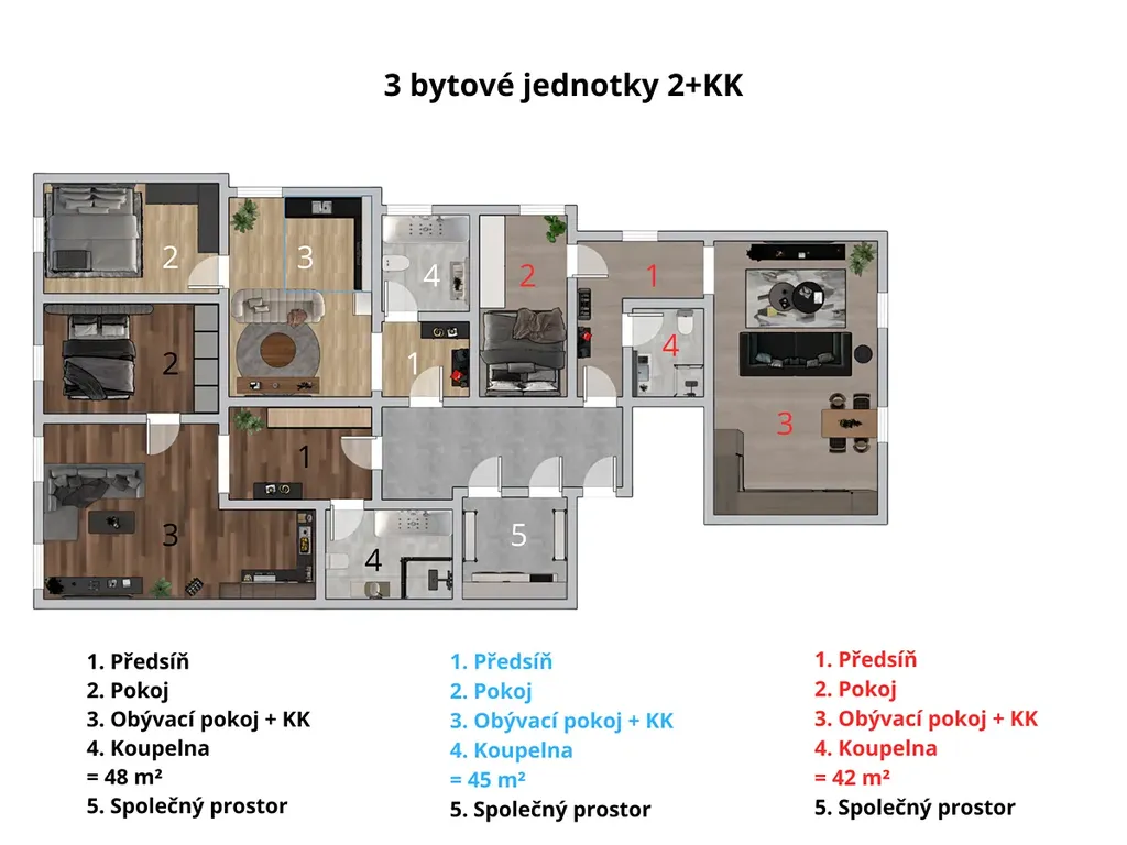 První patro nabízí dvě bytové jednotky o celkové ploše 157 m². Díky chytrému dispozičnímu řešení je možné prostor rozdělit až na tři samostatné byty 2+kk, což je dnes nejžádanější a nejprodávanější typ bytových jednotek na trhu. Velkorysý půdní prostor navíc umožňuje vybudování dalších tří bytů 2+kk. Celkem tak může vzniknout až šest bytů této dispozice v kombinaci s obchodními prostory v přízemí. Dispozice 2+kk jsou nejoblíbenější a nejprodávanější jednotkou – ideální pro stabilní výnos.