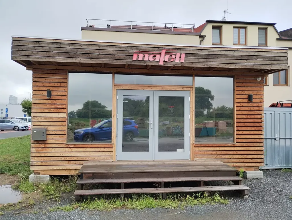vstup: prosklené dveře uprostřed čelní strany + velké prosklené výlohy po stranách