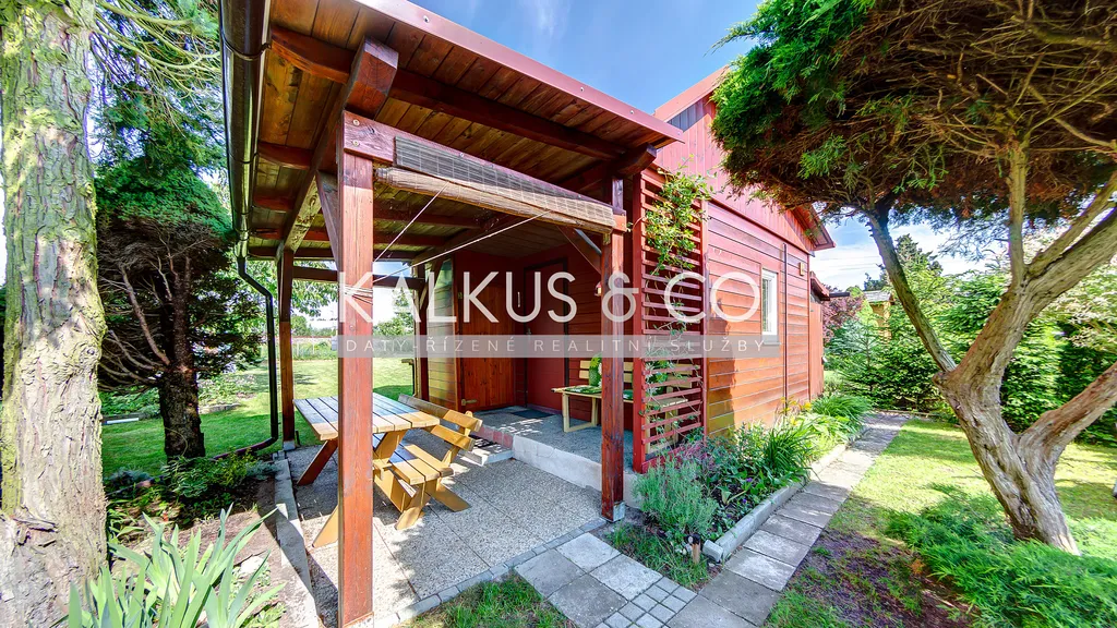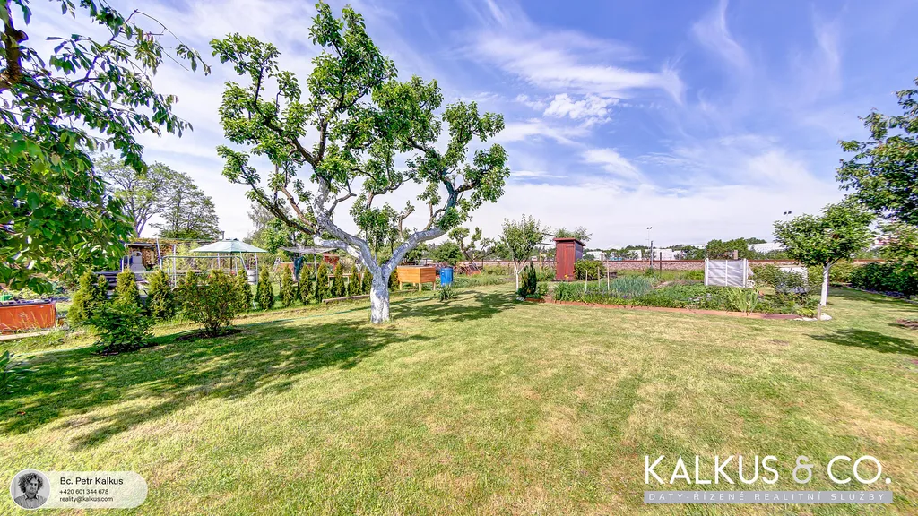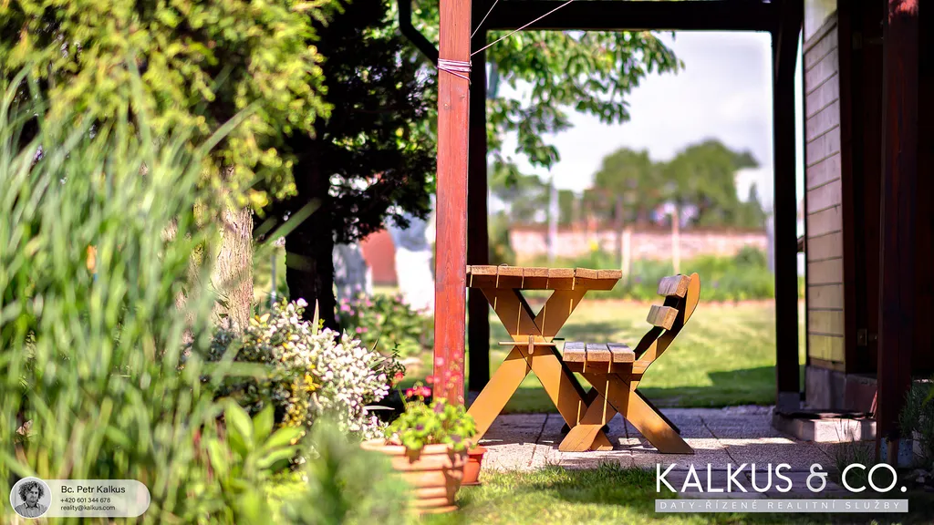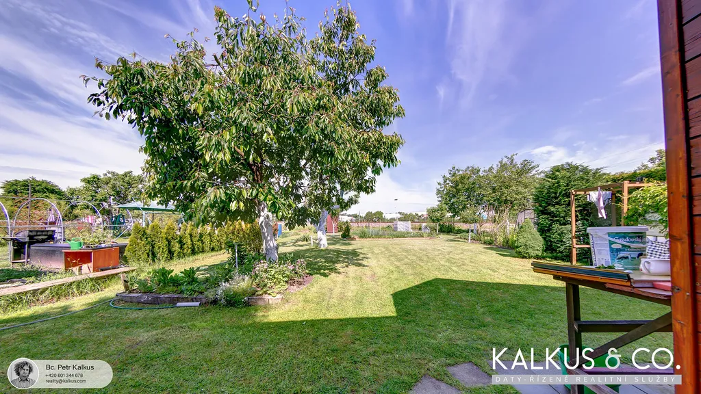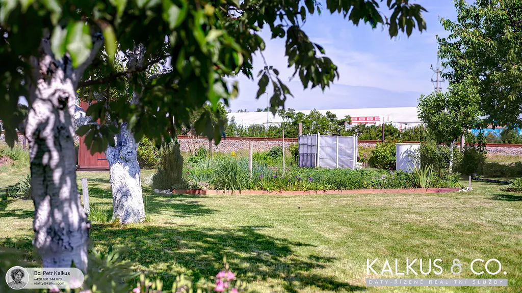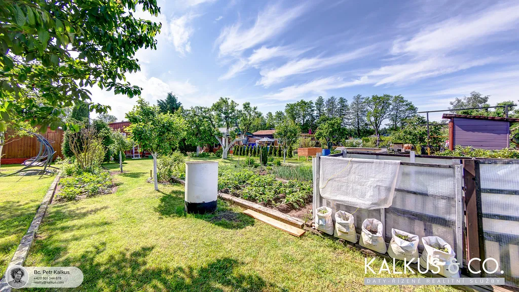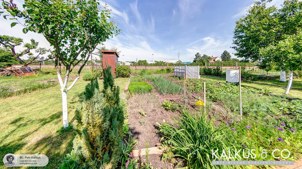 Na pozemku jsou vzrostlé stromy, keře, tůje, rezervoár vody a pečlivě udržovaná zahrádka s vlastními plody.