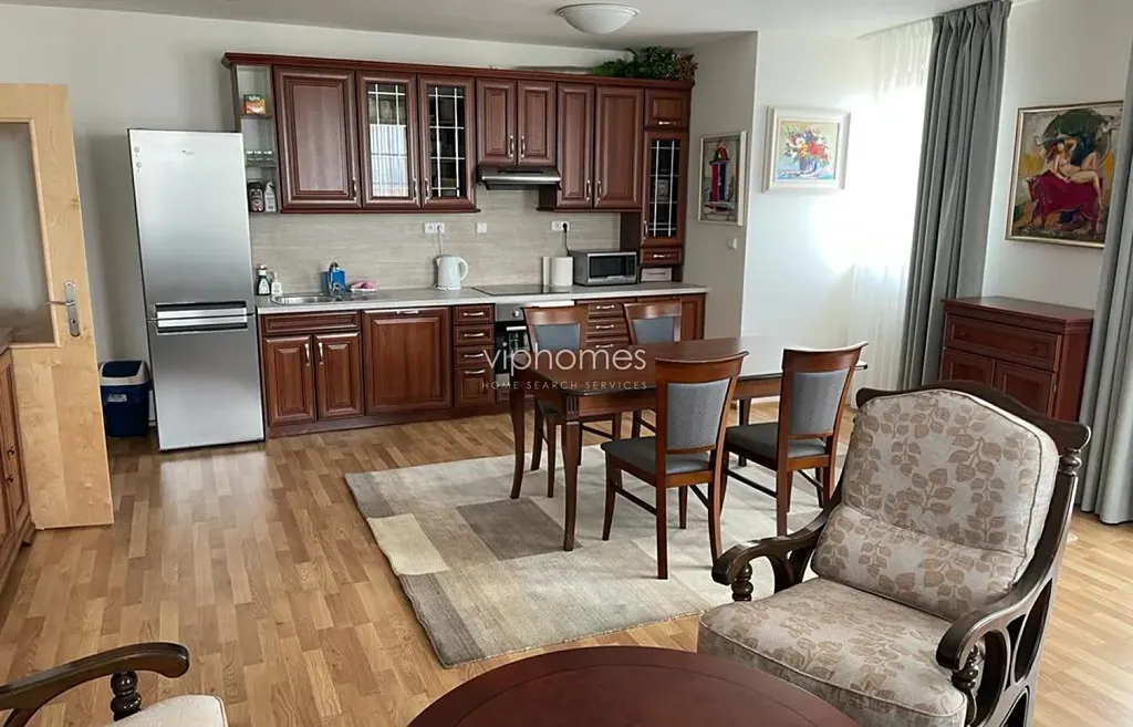 Byt se nabízí kompletně zařízený a sestává z předsíně, obývacího pokoje s plně zařízeným kuchyňským koutem, 2 ložnic, koupelny s vanou a WC, komory. Z obývacího pokoje je vstup na terasu. Plynové topení (samostatné měření spotřeby tepla, vody a elektřiny), bezpečnostní dveře, parkety, domácí telefon s ovládáním domovních dveří, přenos videosignálu od vstupů do budovy na obrazovku TV. Služby :recepce, video sledování od vstupů do budovy na obrazovku TV.