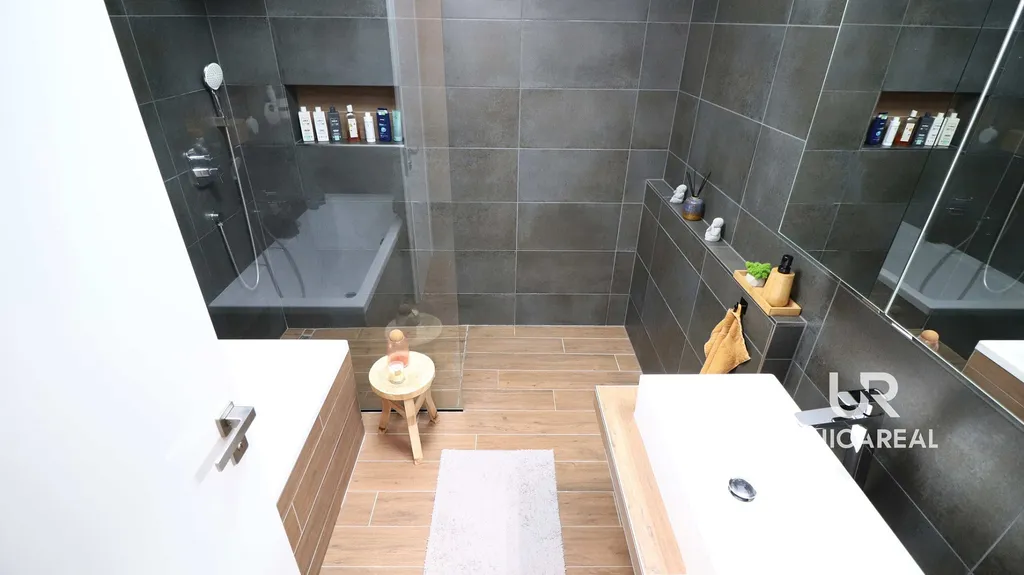 Prostorná koupelna s vanou a sprchovacím koutem, samostatné WC s umyvadlem, zde byla použita kvalitní dlažba (Azulev a Just Life).