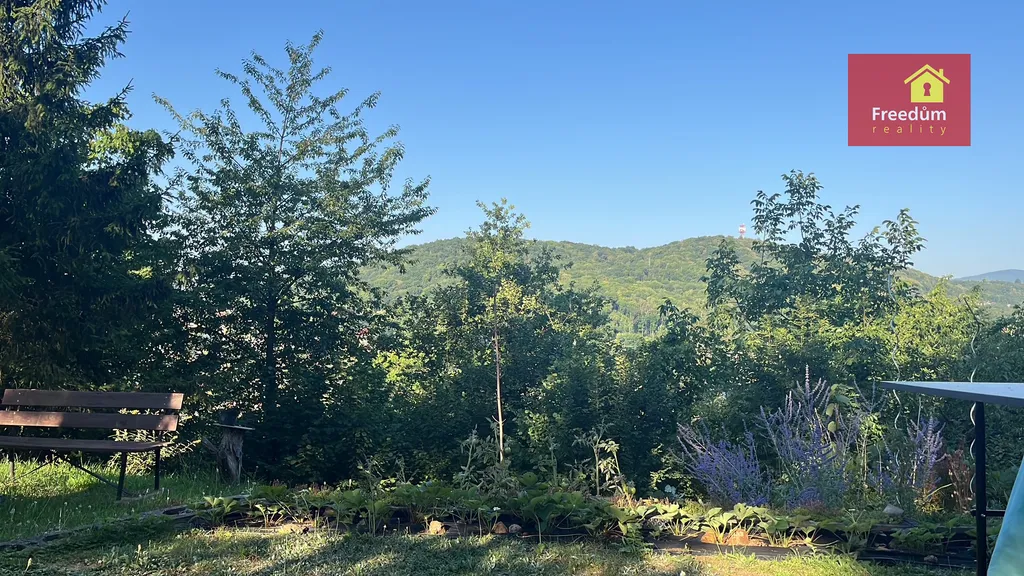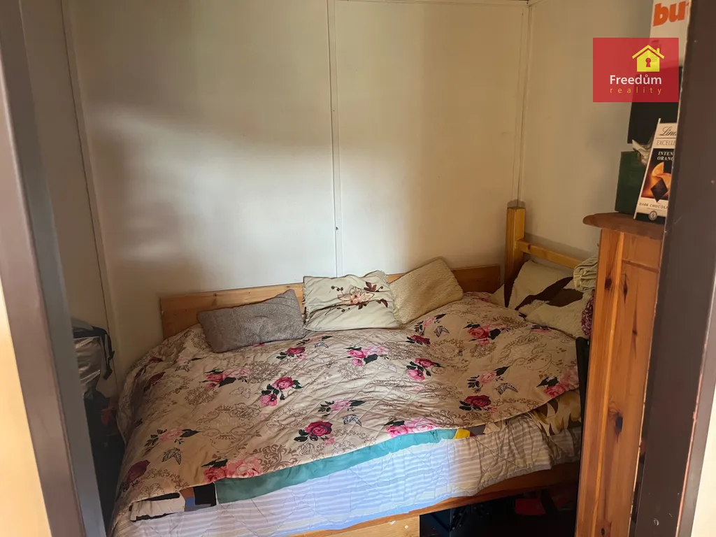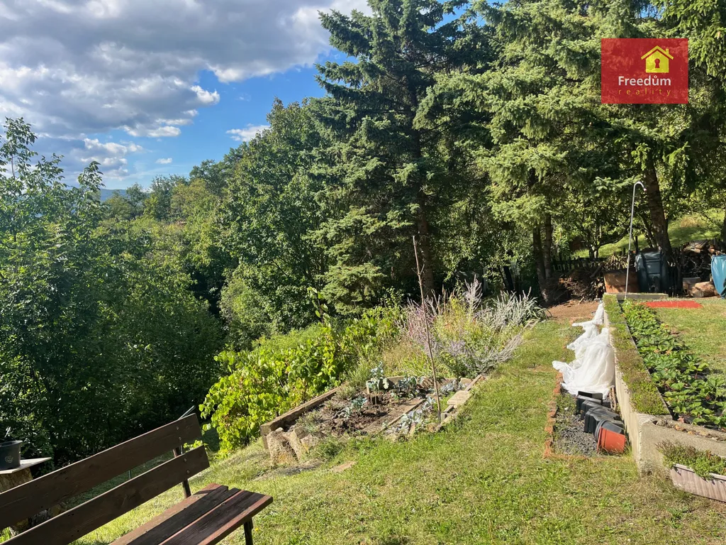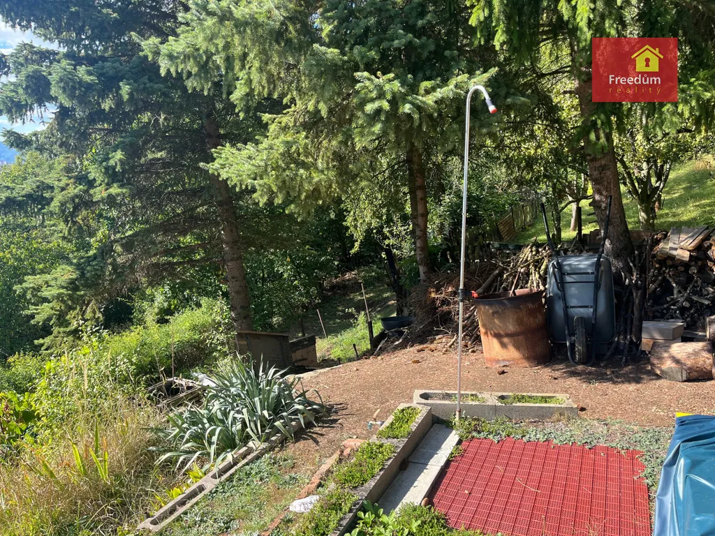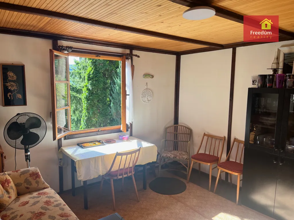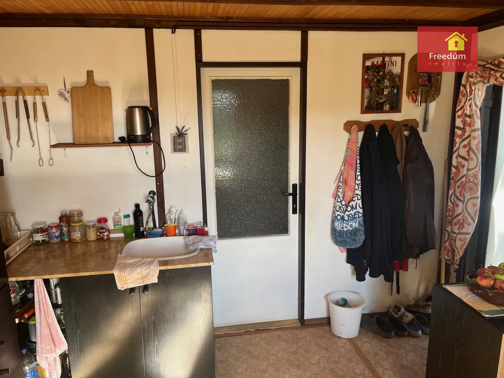 Dřevěná chatka o velikosti 22 m2 s úložným prostorem v podkroví. Zahráda je velká 648 m2.