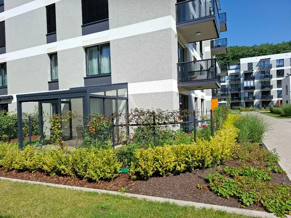 Na zahrádce, která má i vlastní vstup i přes vrátka do vnitrobloku - vyměněná původní zemina za novou a kvalitní, částečně osázeno, květináče osázeny růžemi, které tvoří v létě květinovou bariéru s plotem sousední jednotky (jediný přímý soused).