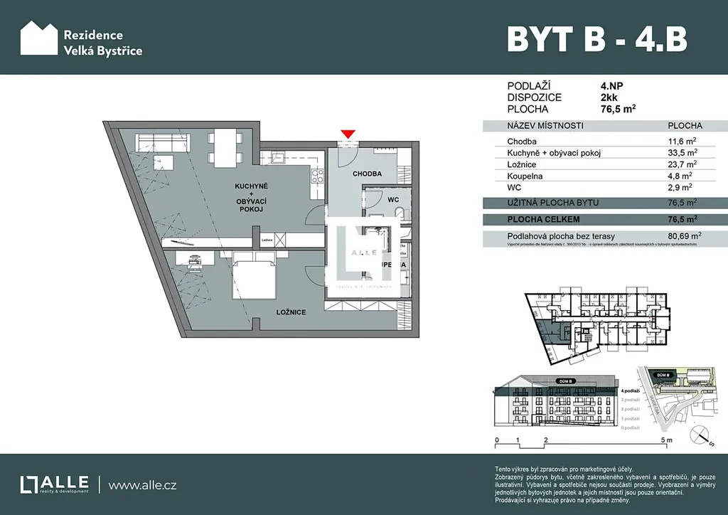 Byt s označením B-4.B o dispozici 2+kk se nachází ve 4.NP čtyřpodlažní budovy „B“. Bytová jednotka má rozlohu 77 m2. K dokoupení je sklep a vnitřní garážové stání v 1.PP budovy.