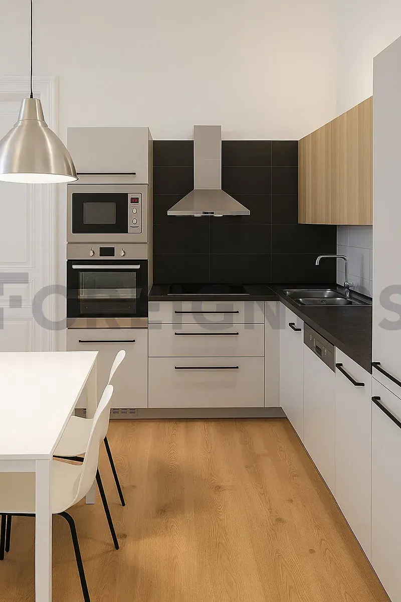 Byt dále obsahuje celkem tři pokoje, koupelnu se sprchovým koutem, oddělené WC a otevřenou kuchyni spojenou s obývacím pokojem. Kuchyně je plně vybavená spotřebiči (trouba, mikrovlnka, myčka, lednice, mrazák, varná deska).