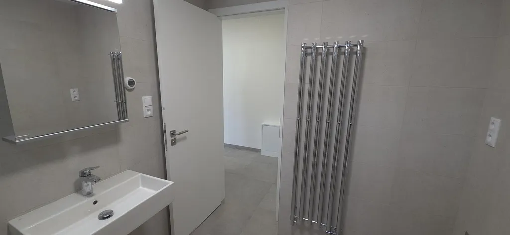 Koupelna je vybavena sprchovým koutem , toaletou, topným žebříkem a umyvadlem s koupelnovou skříňkou.