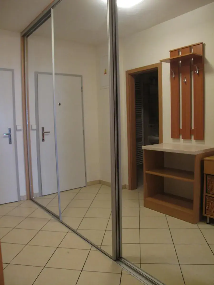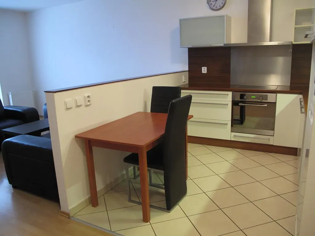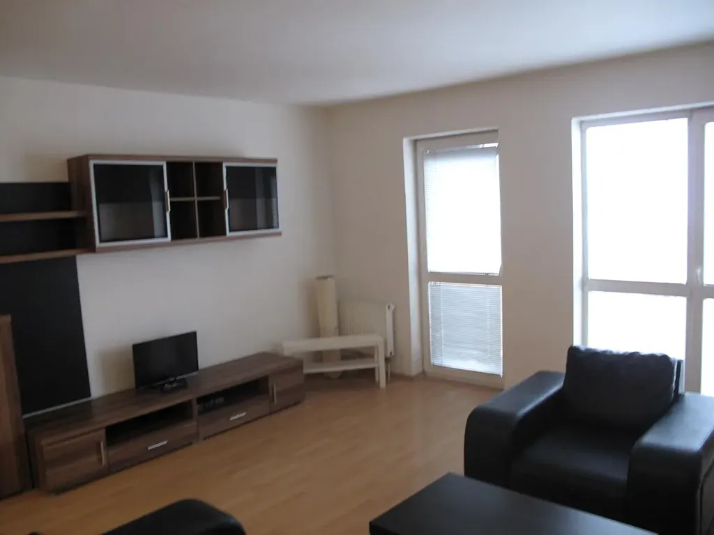 Byt se nabízí částečně vybavený. Součástí kuchyně je prostorná kuchyňská linka s lednicí, elektrickou troubou, sklokeramickou deskou a digestoří. Obývací části dominuje pohodná černá kožená sedací souprava. Spací část je oddělena zdí, což umožňuje prostor využít téměř jako 2+kk. Součástí vstupní chodby je velká třídveřová prosklená vestavěná skříň s dostatkem úložného prostoru. V prostorné koupelně se nachází vana, umyvadlo se zrcadlem, pračka a toaleta.