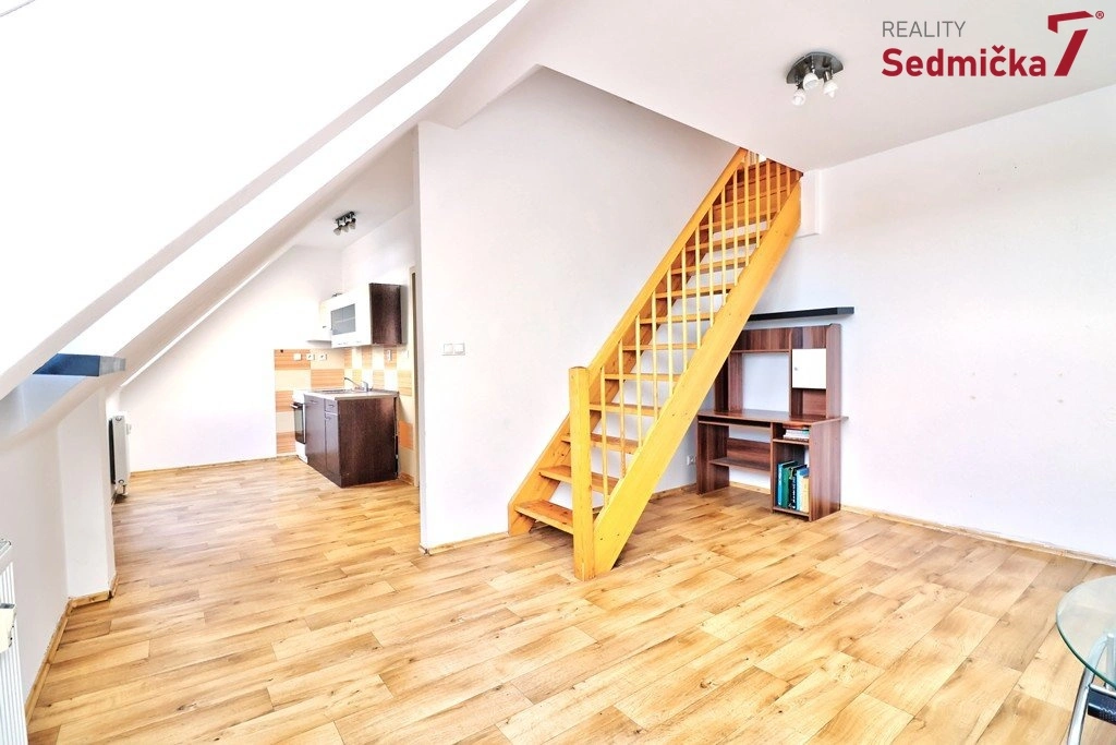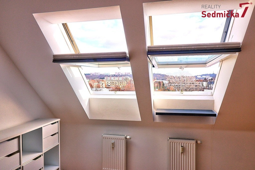 Ve spodním patře bytu je obývací pokoj s kuchyňským koutem, koupelnou s WC a chodbou. Z obývacího pokoje se po schodišti jde do druhého patra bytu se dvěma samostatnými pokoji. Z bytu je hezký výhled směrem na Vinohrady.