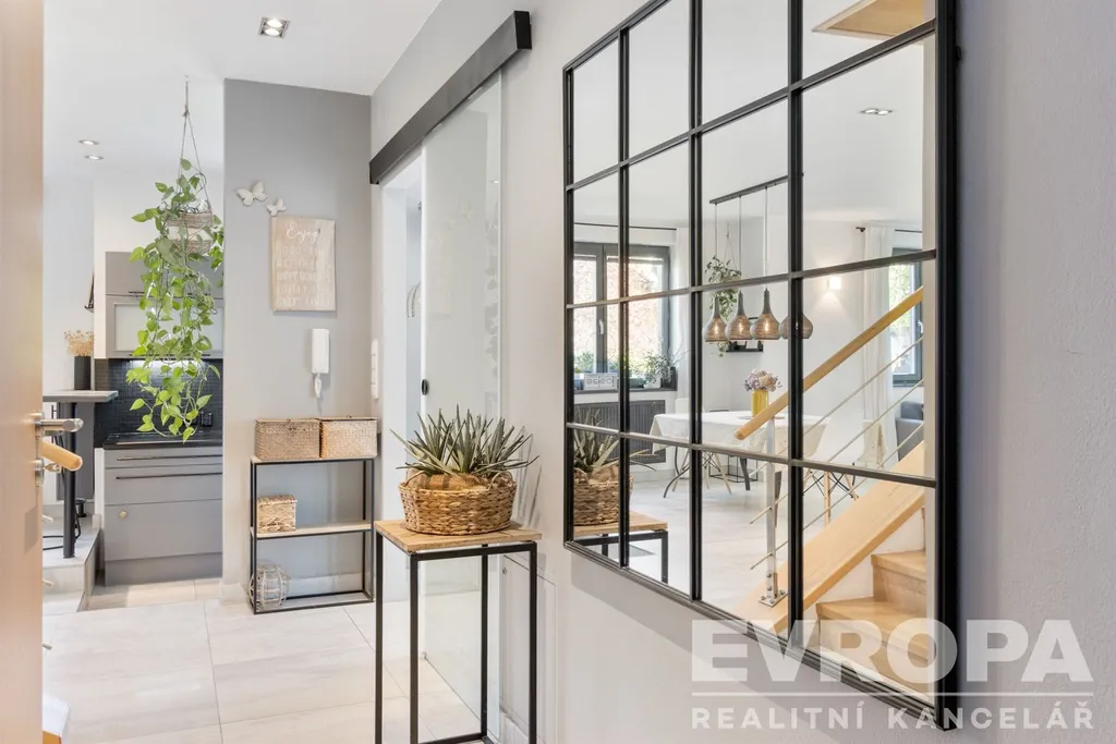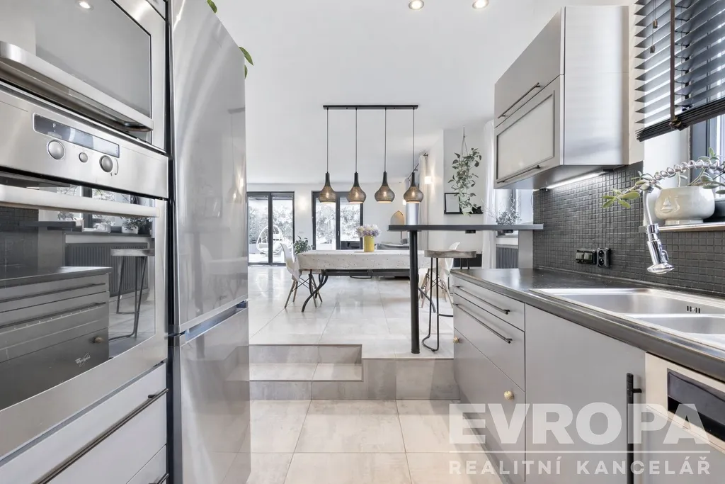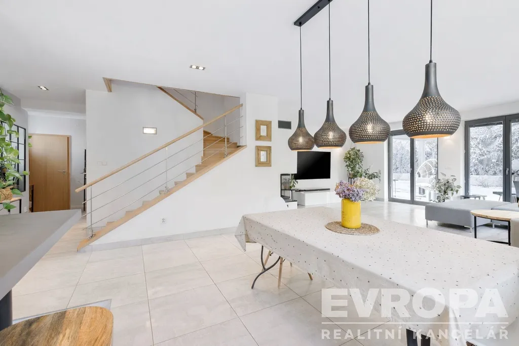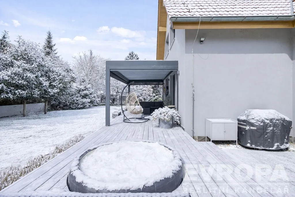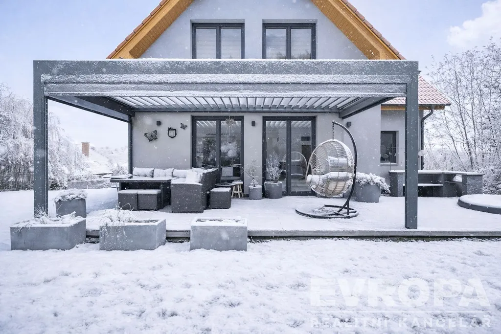 V přízemí se nachází vzdušný obytný prostor propojený s kuchyní a jídelnou, s přímým vstupem na zahradu s terasou. Ta je vybavena bioklimatickou pergolou, vířivkou, grilovacím koutem a venkovním betonovým stolem. Dále je zde samostatný pokoj, koupelna s WC a prostorné zádveří. Vstup do domu vede přes jižní terasu s krásným výhledem do okolí.