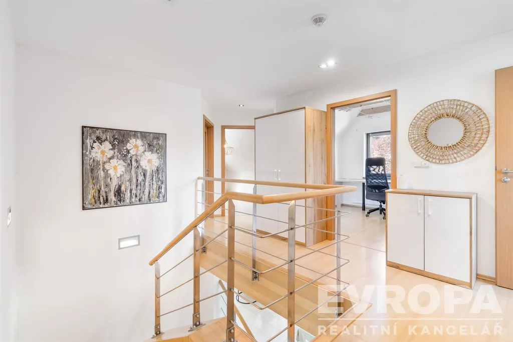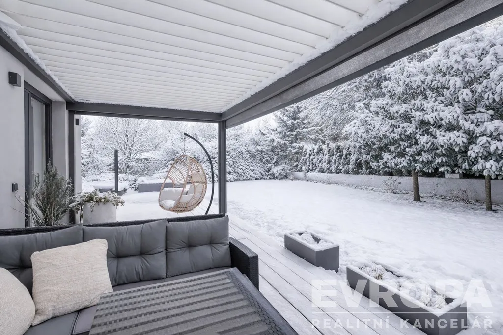 Pozemek se vzrostlými stromy, keři a okrasnou zahradou zaručuje naprosté soukromí a ničím nerušený výhled do údolí. Parkování je zajištěno v garáži a na čtyřech venkovních stáních na vlastním pozemku u domu.