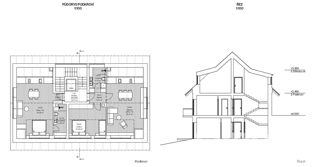 • Podsklepená jednopodlažní budova s obytným podkrovím