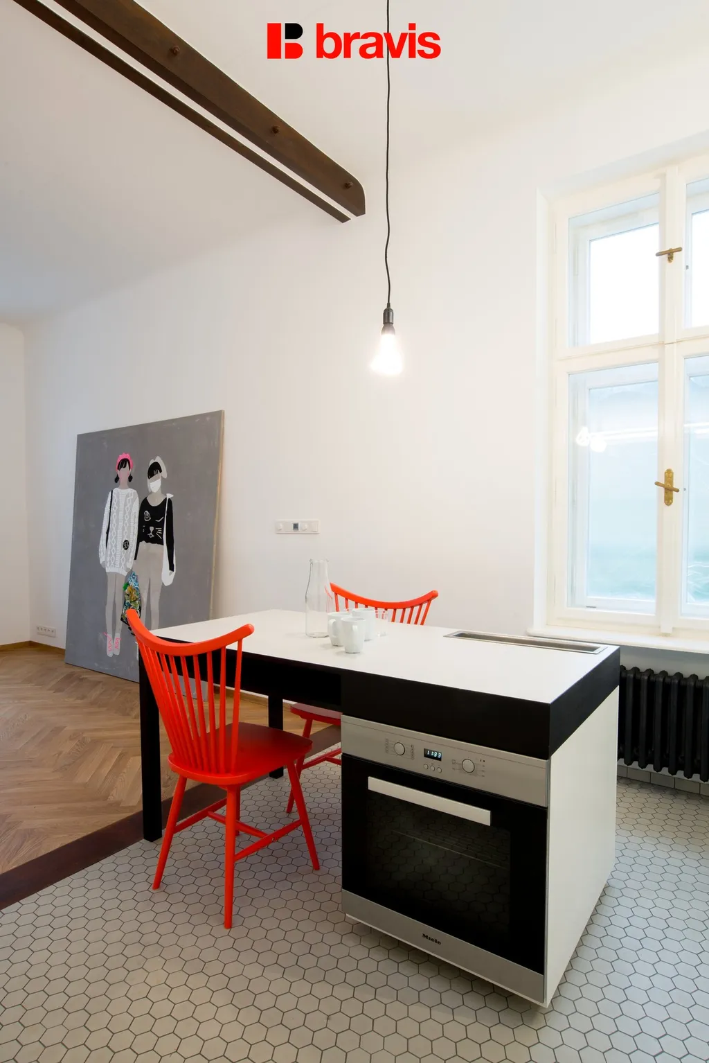 Kuchyňská část je vybavena kuchyňskou linkou vč. vestavných spotřebičů zn. Miele (indukční varná deska, trouba, lednice s mrazákem, pračka) a jídelním pultem se židlemi.