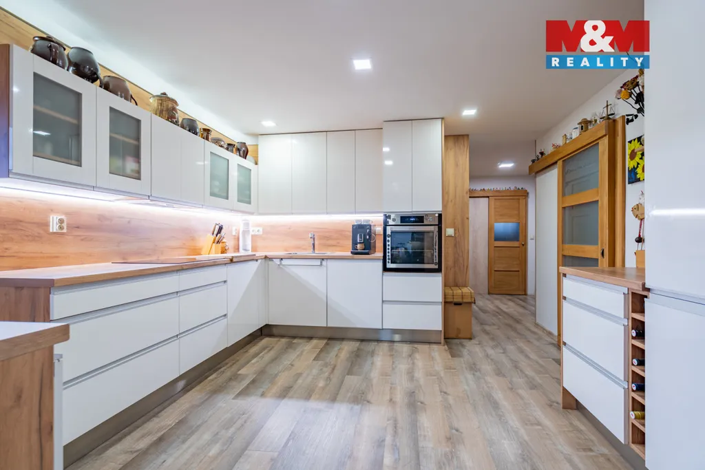Spodní byt disponuje chodbou, koupelnou, samostatným WC, ložnicí, kuchyní a prostorným obývacím pokojem s jídelnou. Horní byt nabízí chodbu, dvě koupelny se dvěma WC, tři dětské pokoje, ložnici a velkou kuchyni propojenou s obývacím pokojem. V domě jsou celkem tři koupelny a tři toalety.
