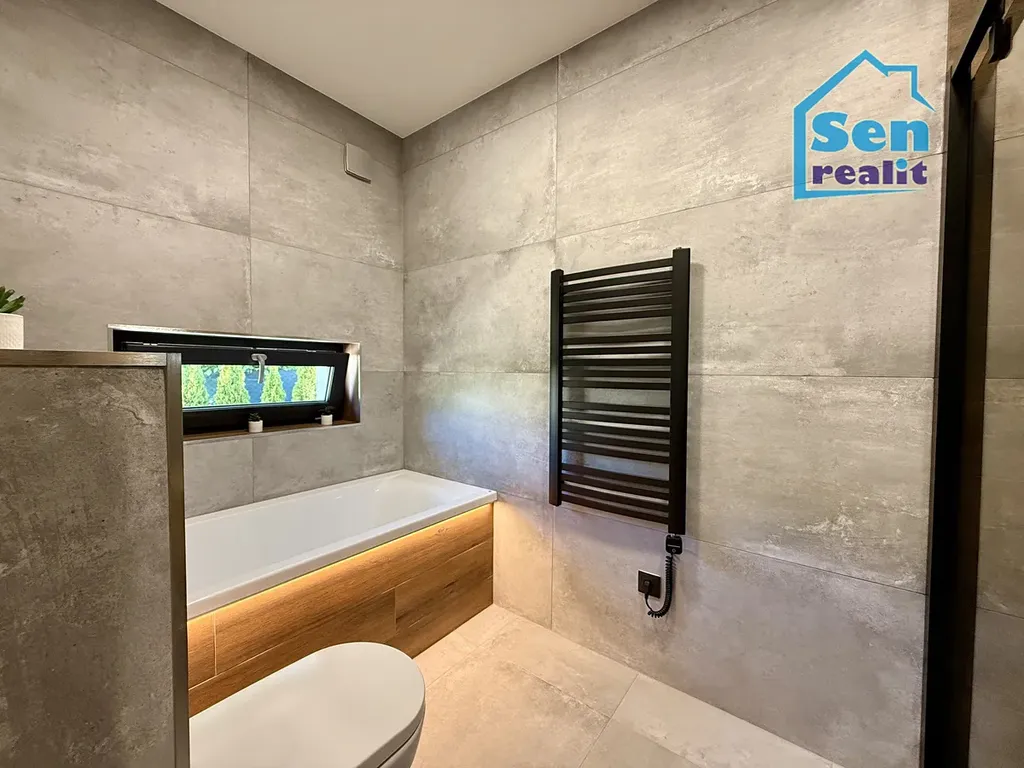 Plovoucí podlaha, stropní světlo s možností volby intenzity jasu, dřevěný parapet, podsvícený lamelový panel