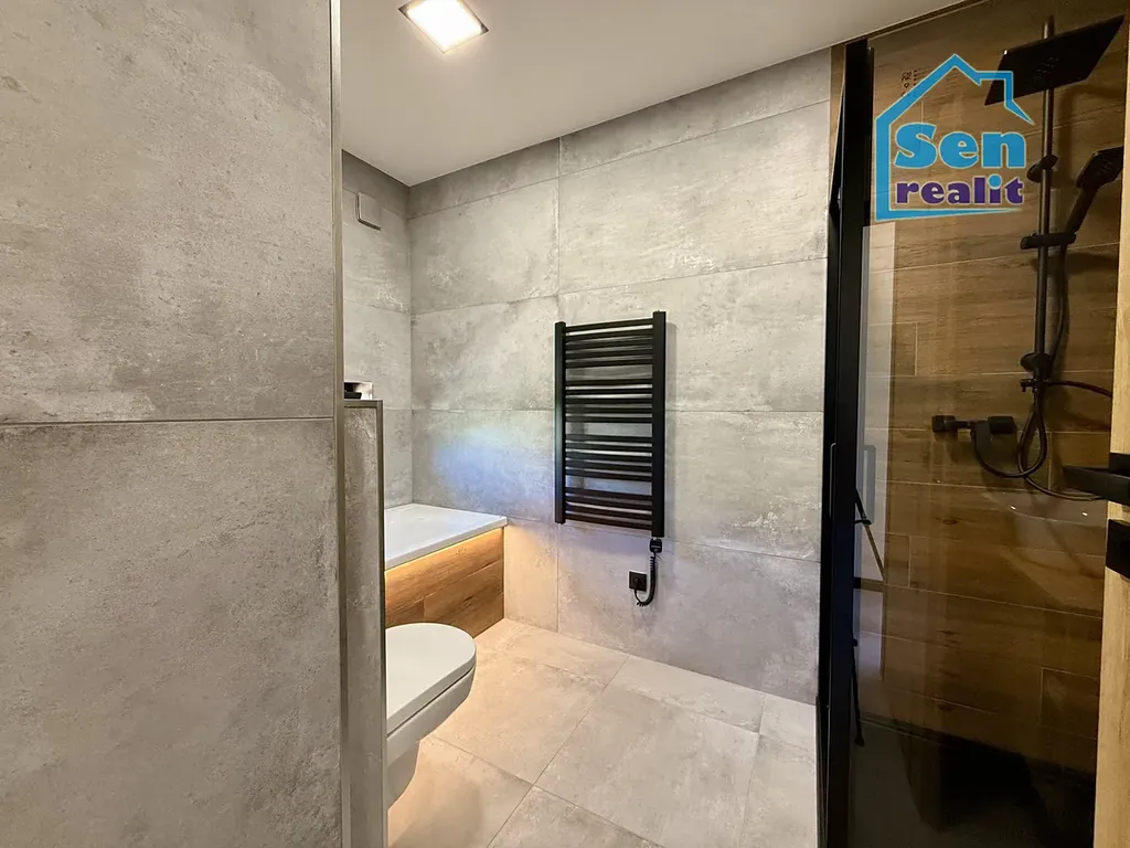 Moderní koupelna se sprchovým koutem, WC a podsvícenou vanou
