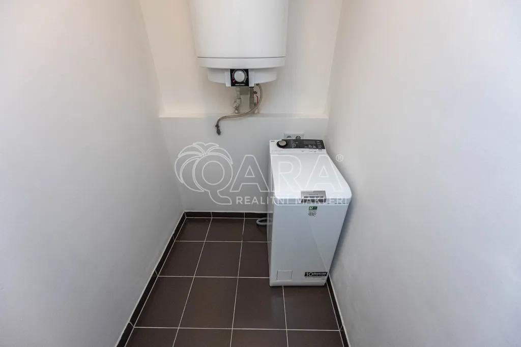 Koupelna je osazena vanou, pračku pak najdete v samostatné technické místnosti, kde je také umístěn bojler na ohřev vody. Vytápění bytu je zajištěnou centrálně a formou radiátorů. Tolik potřebně úložné prostory jsou řešeny velkorysou vestavěnou skříní umístěnou v chodbě. Samotný obytný prostor pak může dýchat a nemusíte řešit další zbytečné komody či skříně.