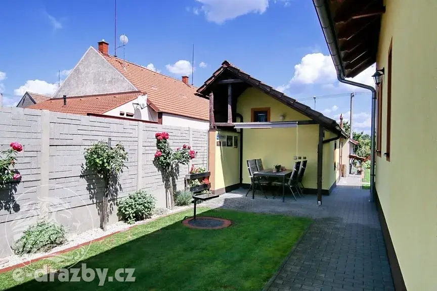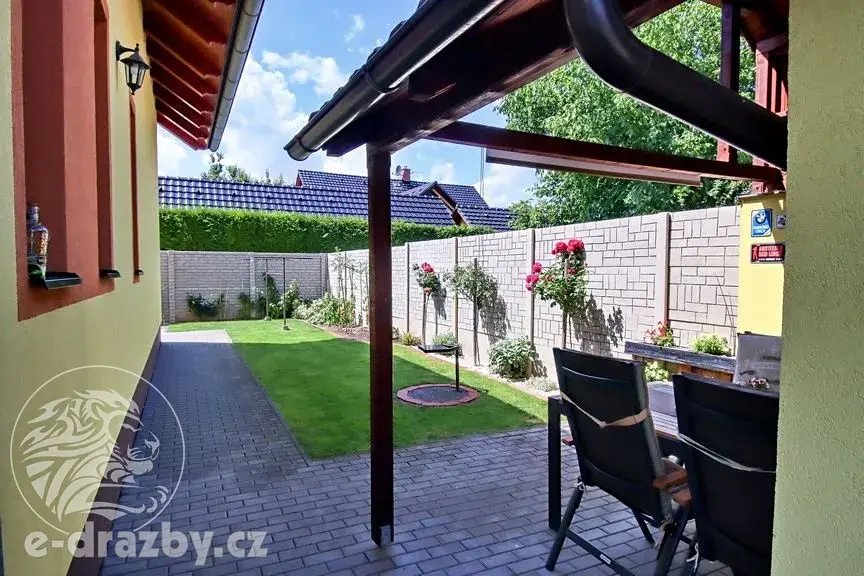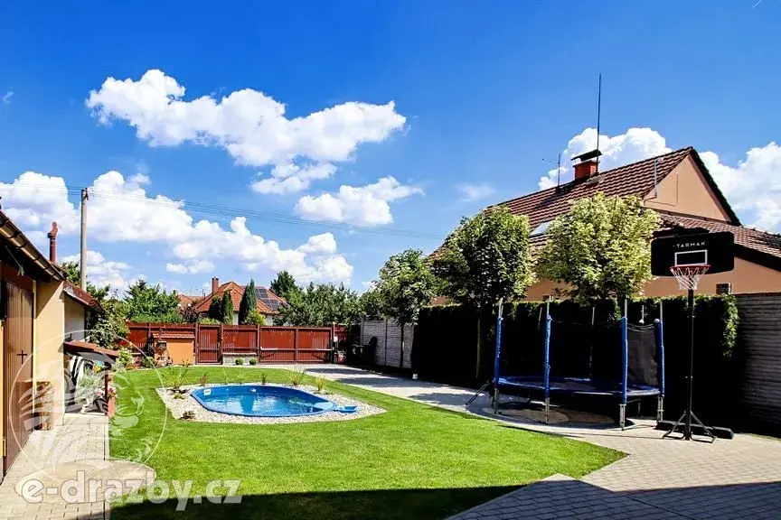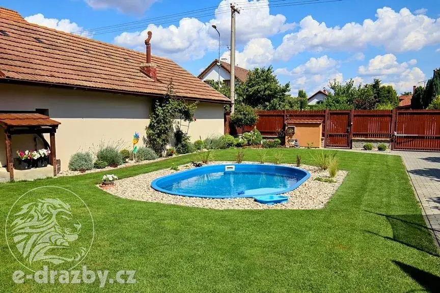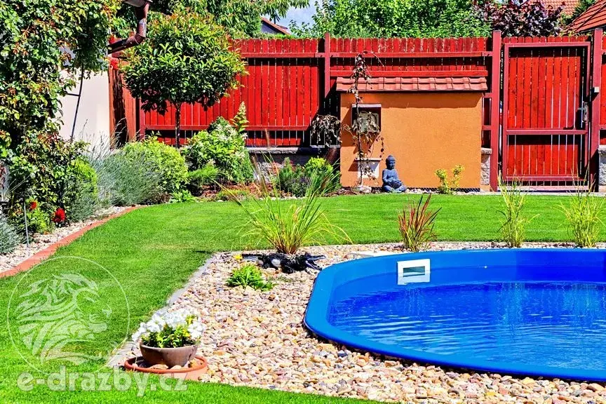 K domu náleží udržovaná zahrada s vestavěným bazénem, zastřešeným venkovním posezením a příjemnou atmosférou pro rodinné chvíle.