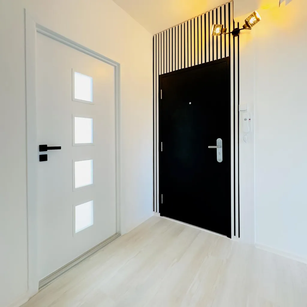 Nová moderní kuchyňská linka s vestavěnými spotřebiči včetně elektrické sklokeramické varné desky, myčky nádobí, mikrovlnné trouby, elektrické trouby a chladničky s mrazákem. Interiér doplňují nové dveře do všech místností kuchyně, ložnice, obývacího pokoje, koupelny i na toaletu. Bezpečnostní vchodové dveře a futra byly také vyměněny a okolí dveří je obloženo dekorativními a protihlukově izolačními pásy.