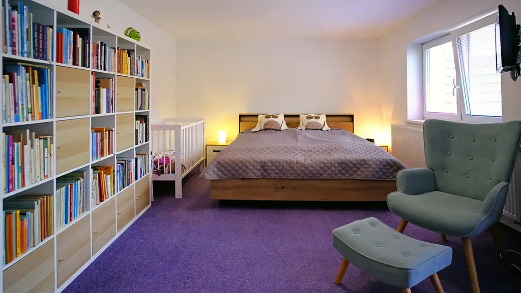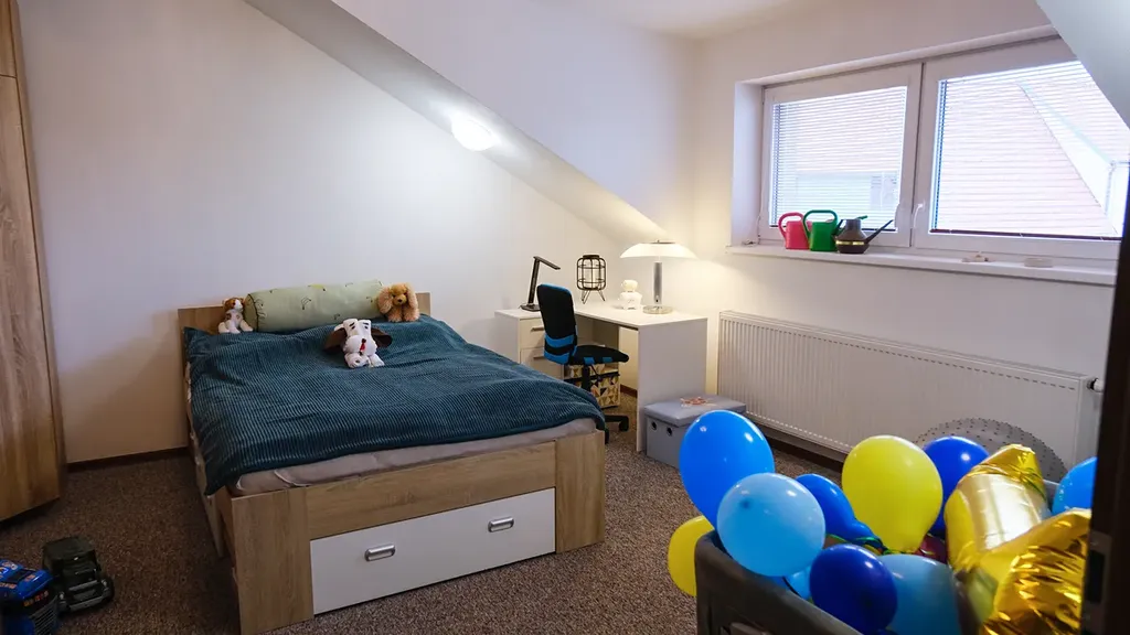 - chodba, koupelna - 2 x umyvadlo, sprchový kout, vana, samostatné WC, ložnice s vestavěnou šatnou vstupem na terasu, šatna, dětský pokoj, kuchyně s kuchyňským sezením a obývacím pokojem se vstupem na terasu (manuál.+ el. ovládání markýzy na terase), vstup na půdu