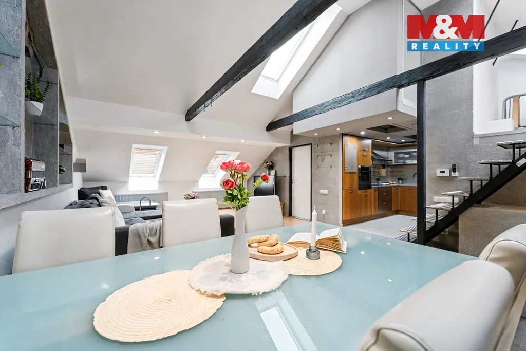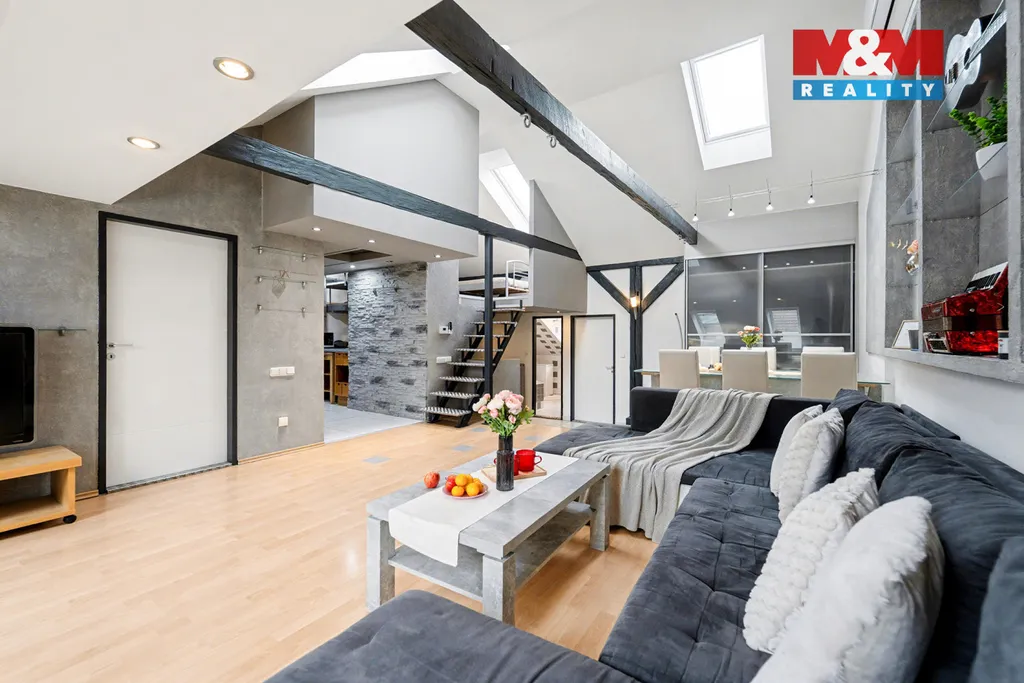 A právě zde, jen pár kroků od náplavky, vznikl originální mezonet 4+kk, který vás okamžitě zaujme svou vzdušností, mimořádným prostorem a designovou duší.