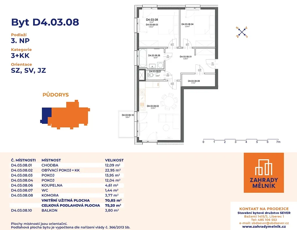 Jedná se o byt 3+kk o velikosti 75,2 m2 s balkónem o velikosti 3,80 m2. Byt se nachází ve 3. nadzemním podlaží moderní novostavby s výtahem.