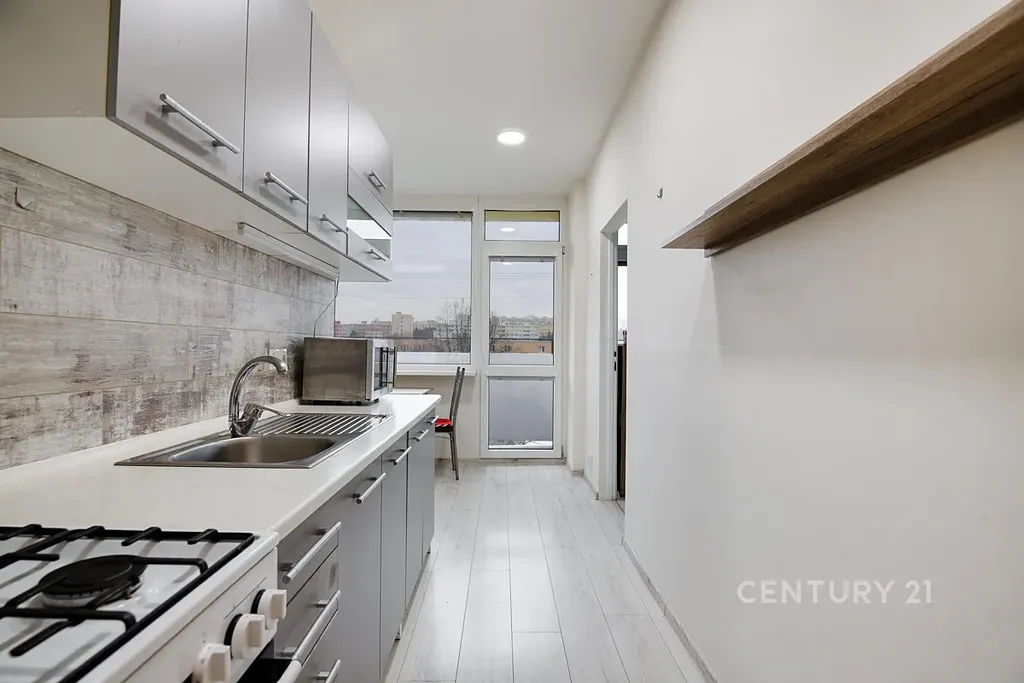 S tímto pokojem sousedí kuchyně, kde se nachází kuchyňská linka, sporák, mikrovlnná trouba, skříňka a stůl se židlemi. I zde je vstup na další lodžii.