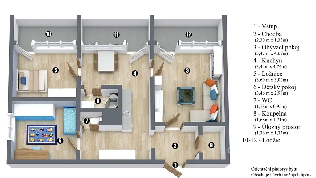 Dále jsou v bytě dva pokoje, kdy jeden z nich má opět vstup na poslední lodžii.